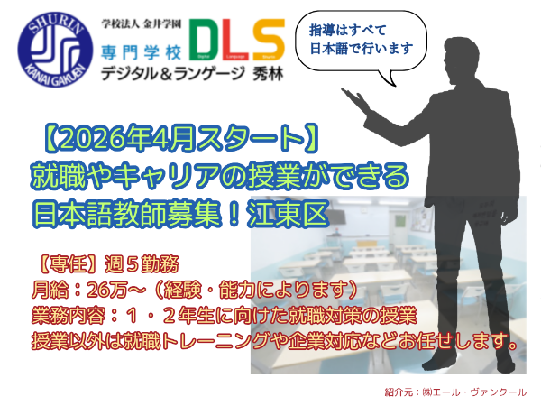 | 就業時間 | 定時 午前9時~午後5時 休憩時間: 60分 学生の夏季休暇中は時短勤務となります。 2025年例:10時~15時 ※勤務開始日:2026年4月スタート 慣れていただくために、前倒しで勤務も可能です。 ※3月末には全体講師会議があります。 ※授業見学は11月~1月授業進捗に合わせ相談可能。 |